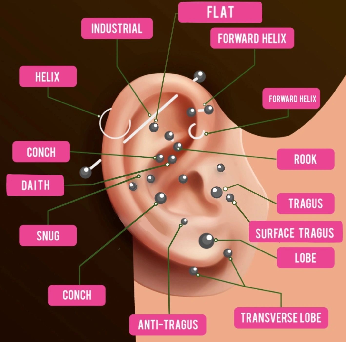 Use this diagram to help you understand the names and locations of the piercings you would like.